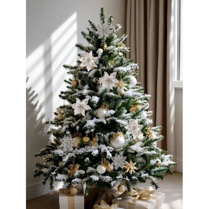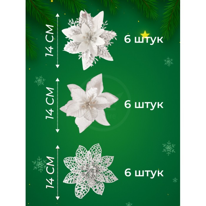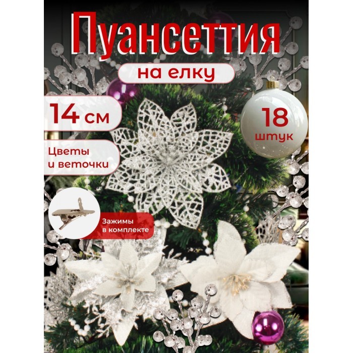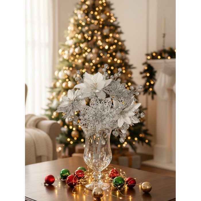 Набор Цветы Пуансеттия (18 штук - 14 см + веточки+зажимы) серебро 266221