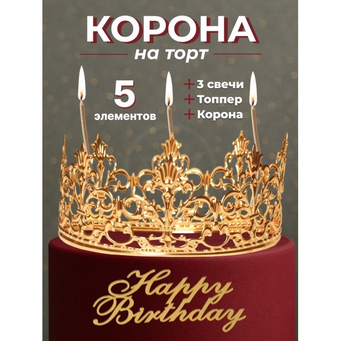 Корона на торт золотая+топпер Happy birthday (1шт) +Свечи (3 шт), золото 266160